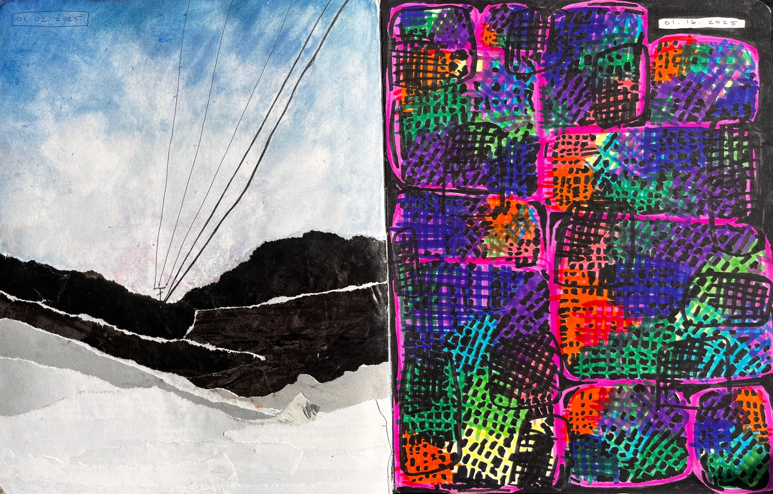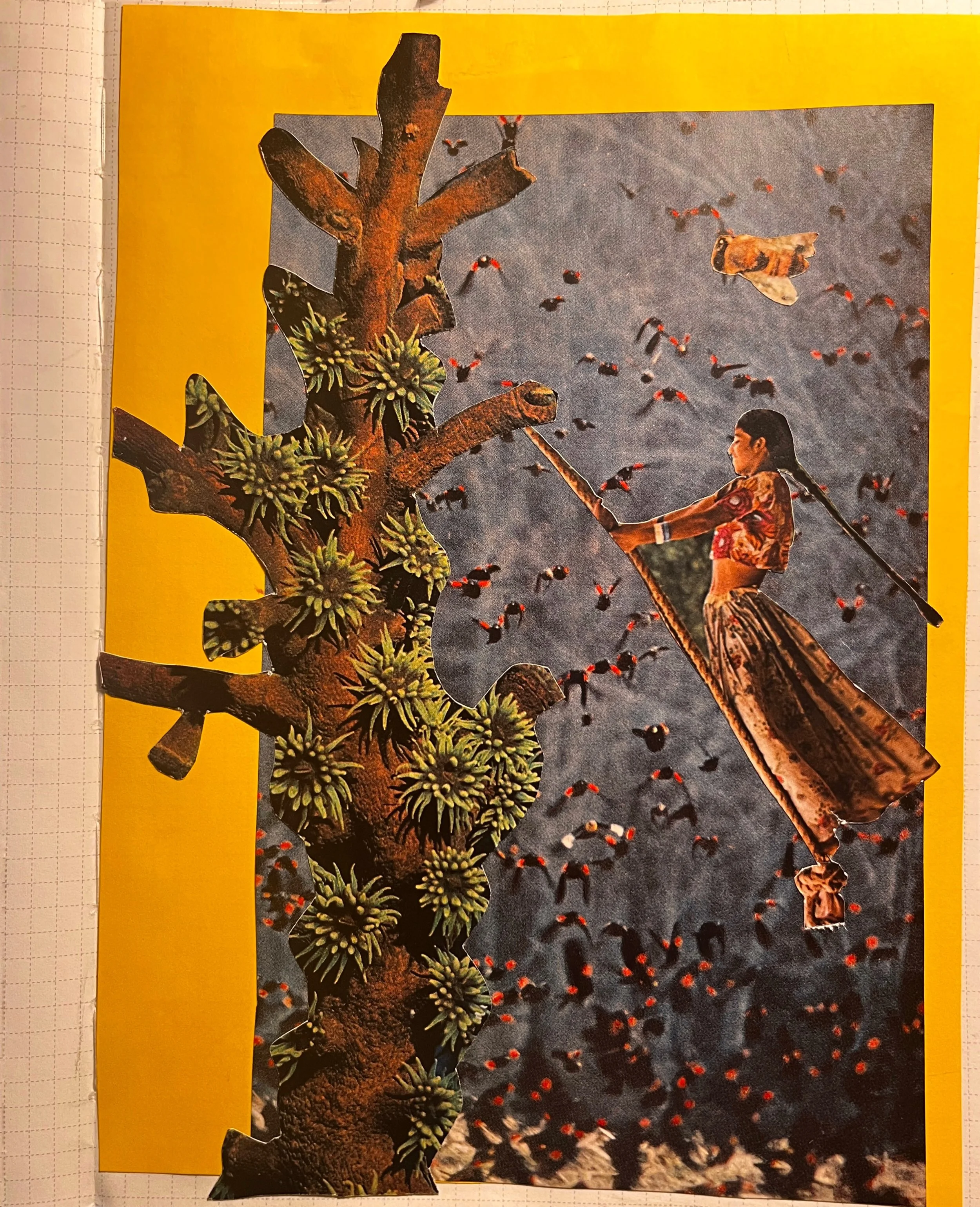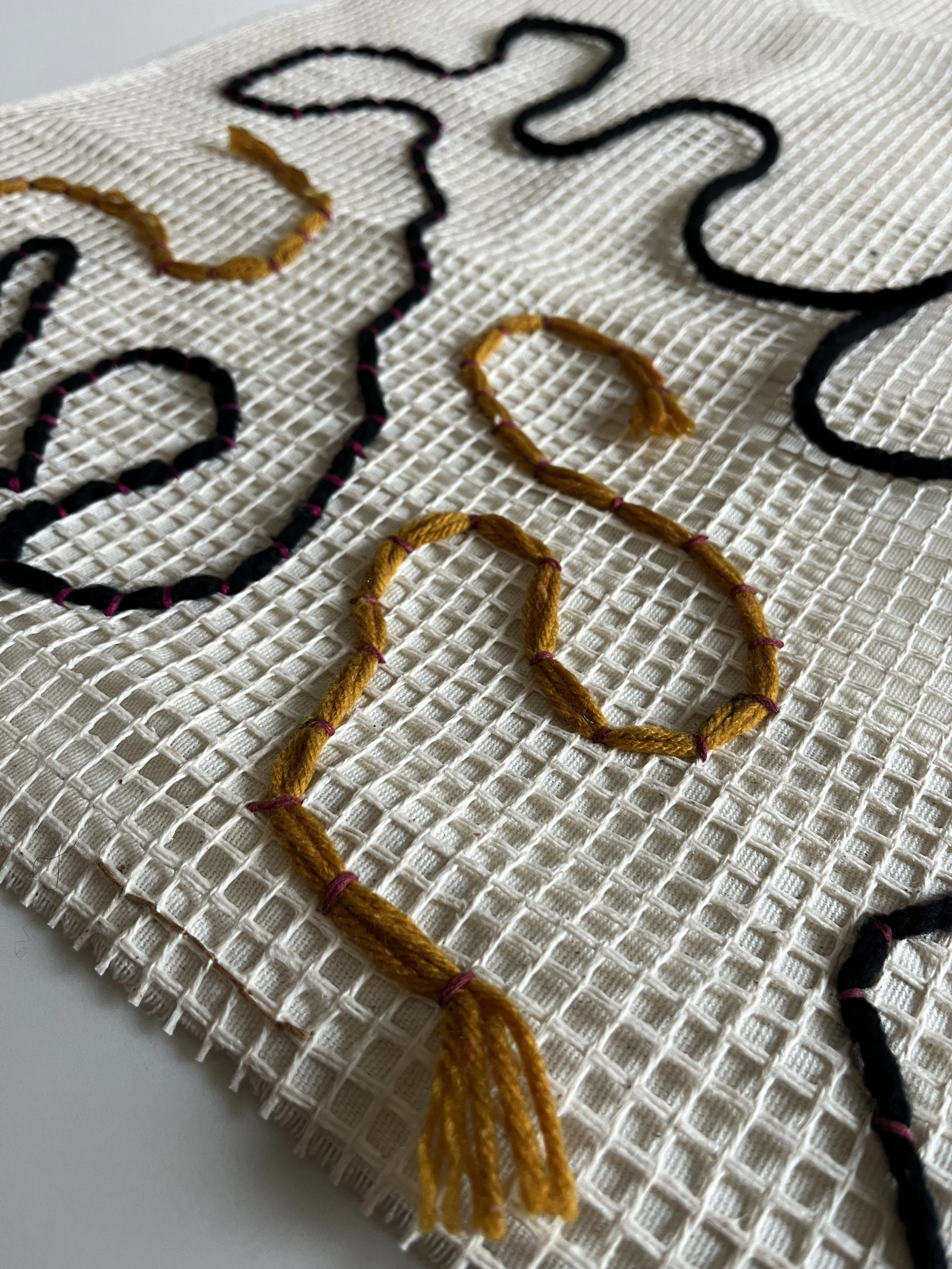 This series of embroidery on black canvases combines leftover scraps of an Indian silk saree with traditional embroidery thread. The combination is meant to give ode to the cultural context from which I emerge and highlight the beauty of traditional textiles.